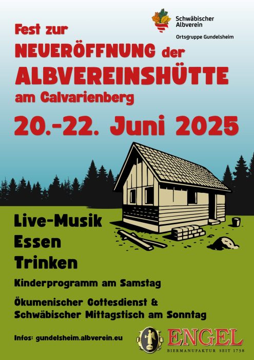 Eröffnungsfest Albvereinshütte Fr., 20.06.2025 - So., 22.06.2025, Uhrzeit: 16:00 - 23:59 iCalendar Mit dem Laden der Karte akzeptieren Sie die Datenschutzerklärung von Google.Mehr erfahren Karte laden Google Maps immer entsperren zur Übersicht